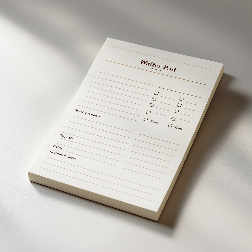 Praktiske blokke til tjenere til at tage ordrer. Tilpasselig med restaurantnavn, sektioner til ordredetaljer. Ideel til travle spisemiljøer for at holde servicen glidende.